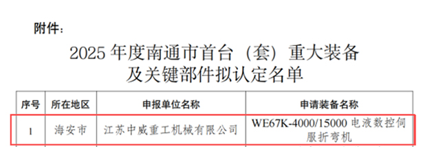 近日,南通市工業(yè)和信息化局對(duì)2025年度南通市首臺(tái)(套)重大裝備及關(guān)鍵部件擬認(rèn)定名單進(jìn)行公示,我司W(wǎng)E67K-4000/15000電液數(shù)控伺服折彎機(jī)成功入選。